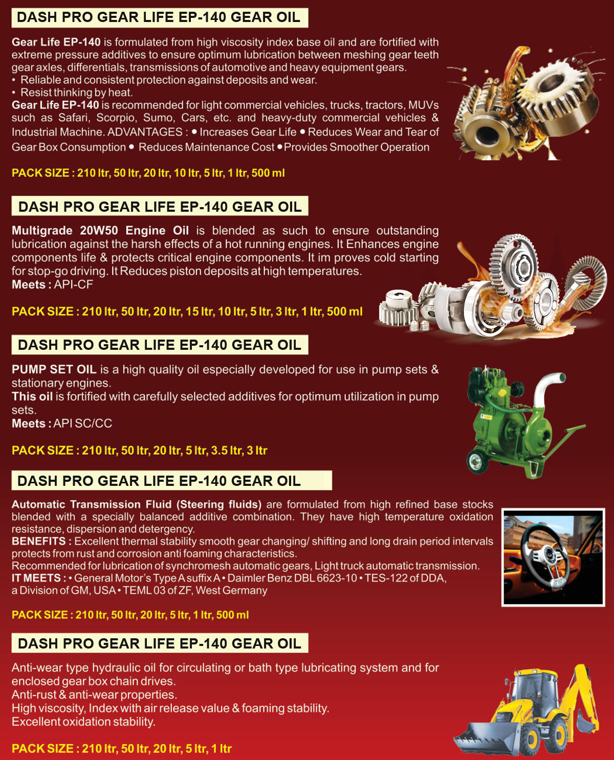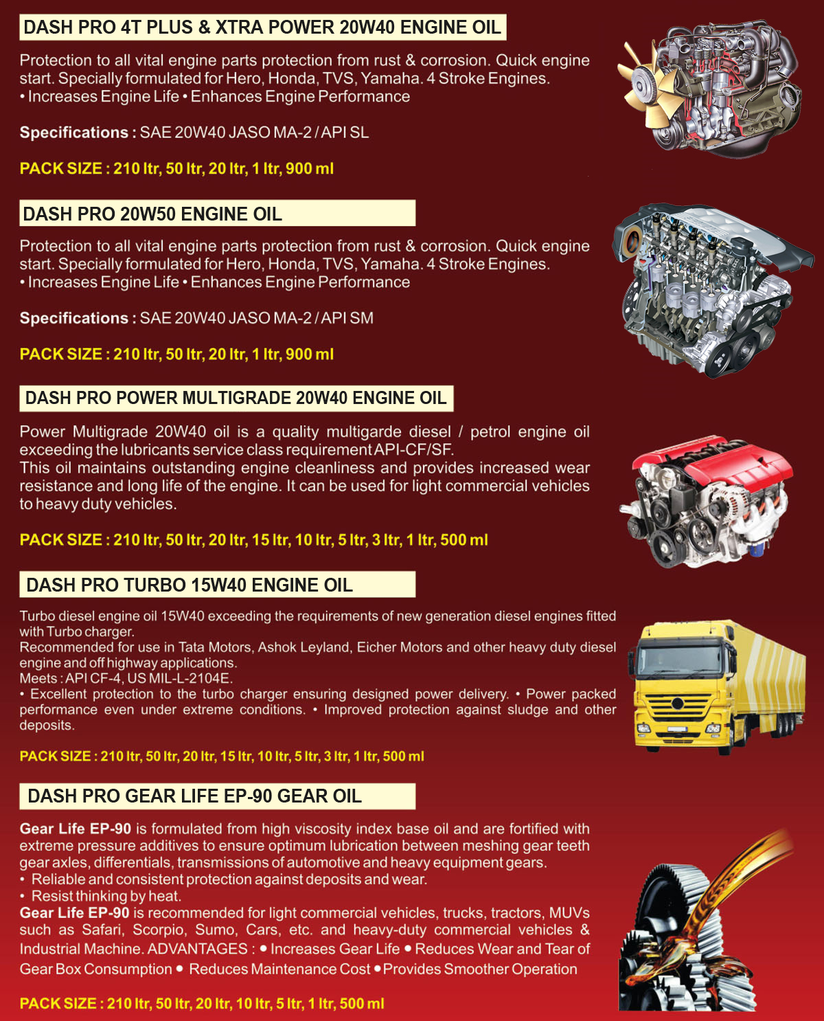 All Automotive Grade Oil, Industrial Oil, Gear Oil, Brake Fluid, Greases & Coolant.